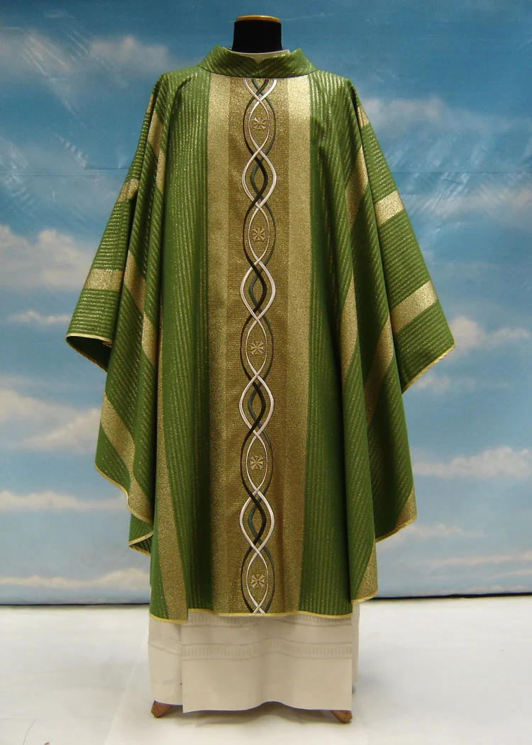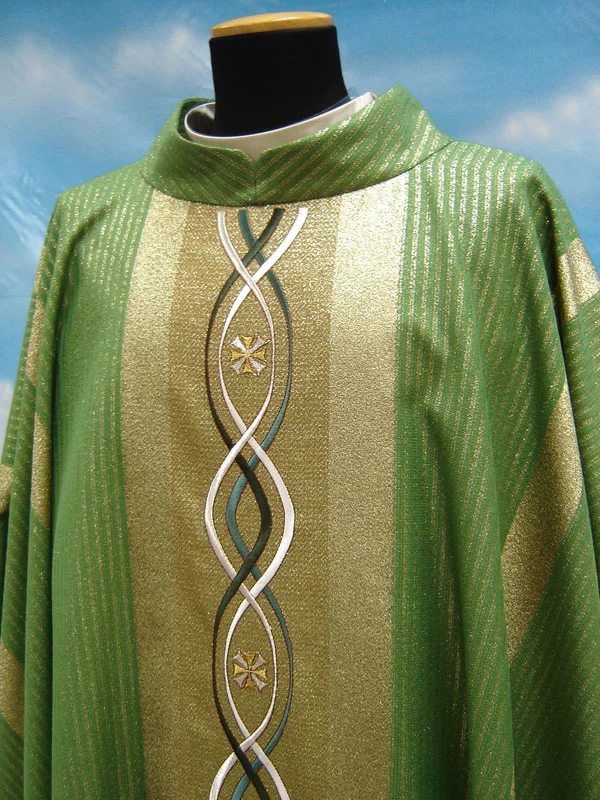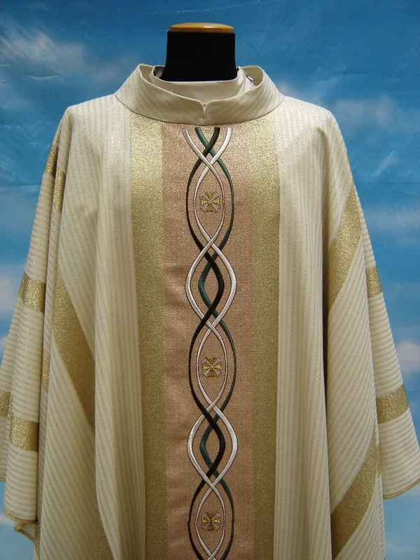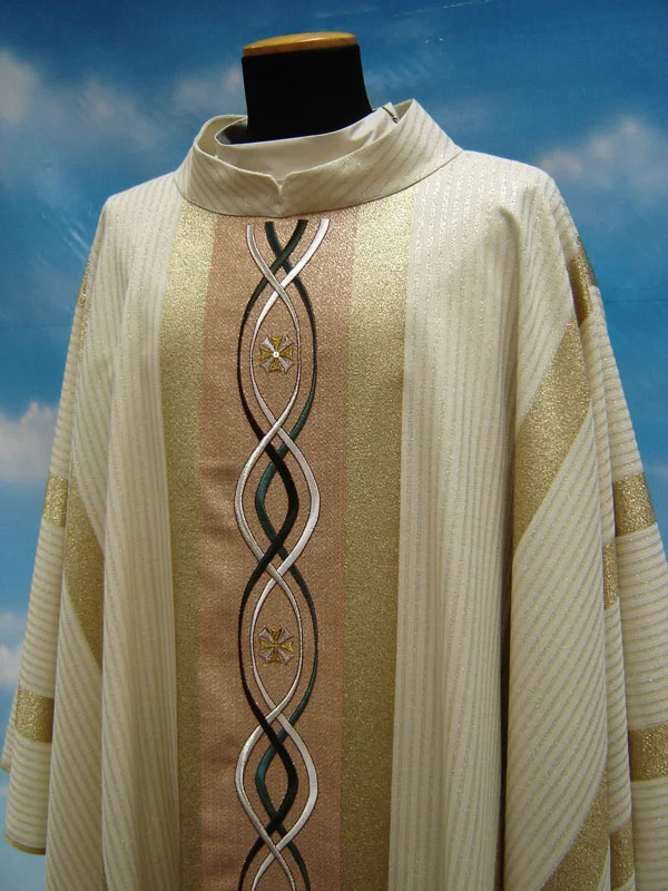 Práctica casulla realizada de forma artesanal en el telar con una elaboración muy cuidada. Ornamentada con un elegante y estilizada bordado. En el precio se incluye la estola.