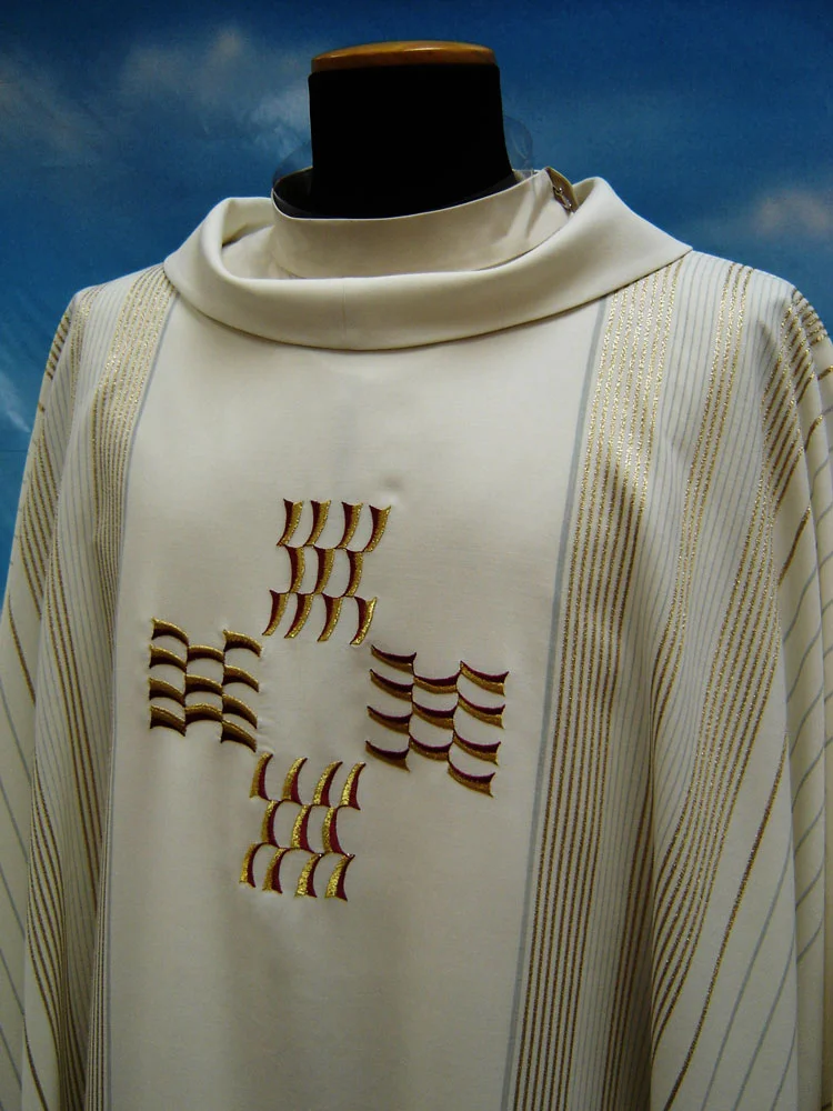 Práctica casulla realizada de forma artesanal en el telar con una elaboración muy cuidada. Ornamentada con una elegante y estilizada cruz bordada en oro. En el precio se incluye la estola.