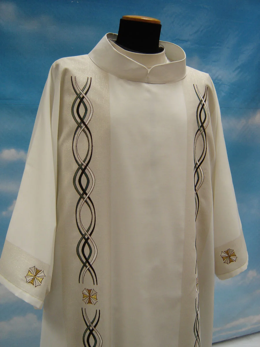 Práctica Dalmática realizada de forma artesanal en el telar con una elaboración muy cuidada. Ornamentada con un elegante y estilizado bordado.