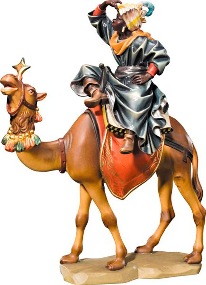 Balthazar King on camel with base of high quality in noble woods. Normally in linden, maple or oak wood. Sculpture with a perfect finish.