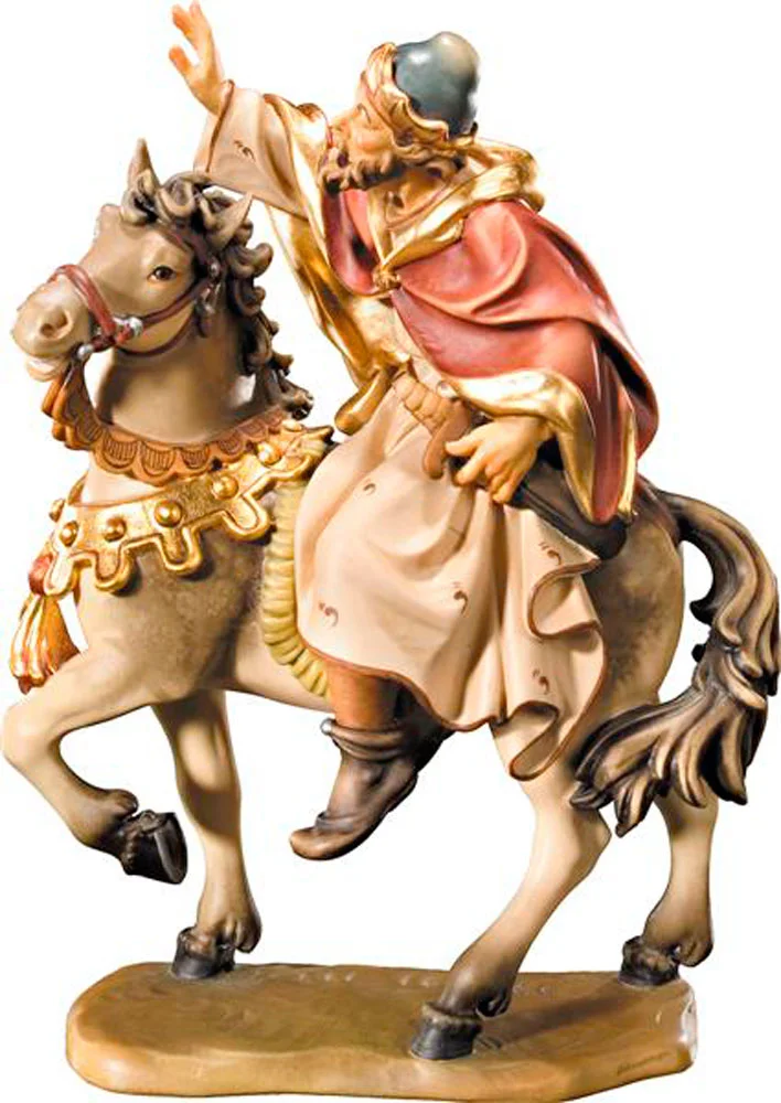 Caspar King on horse with base of high quality in noble woods. Normally in linden, maple or oak wood. Sculpture with a perfect finish.