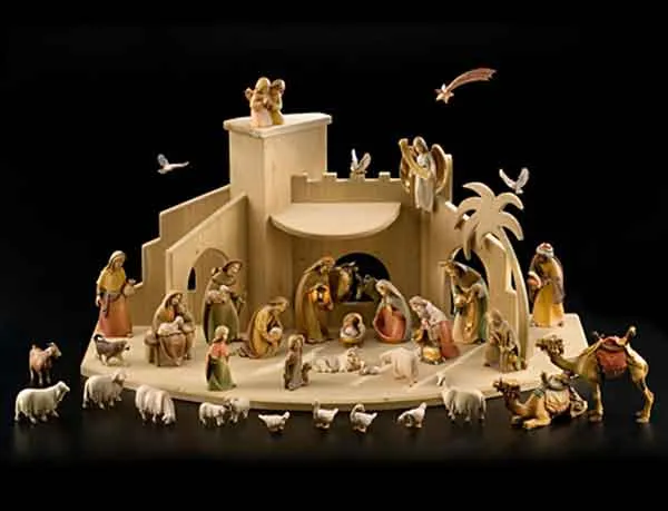 Carved wooden image. Complete set 40 pieces (Jose 3H with stable) in noble woods.