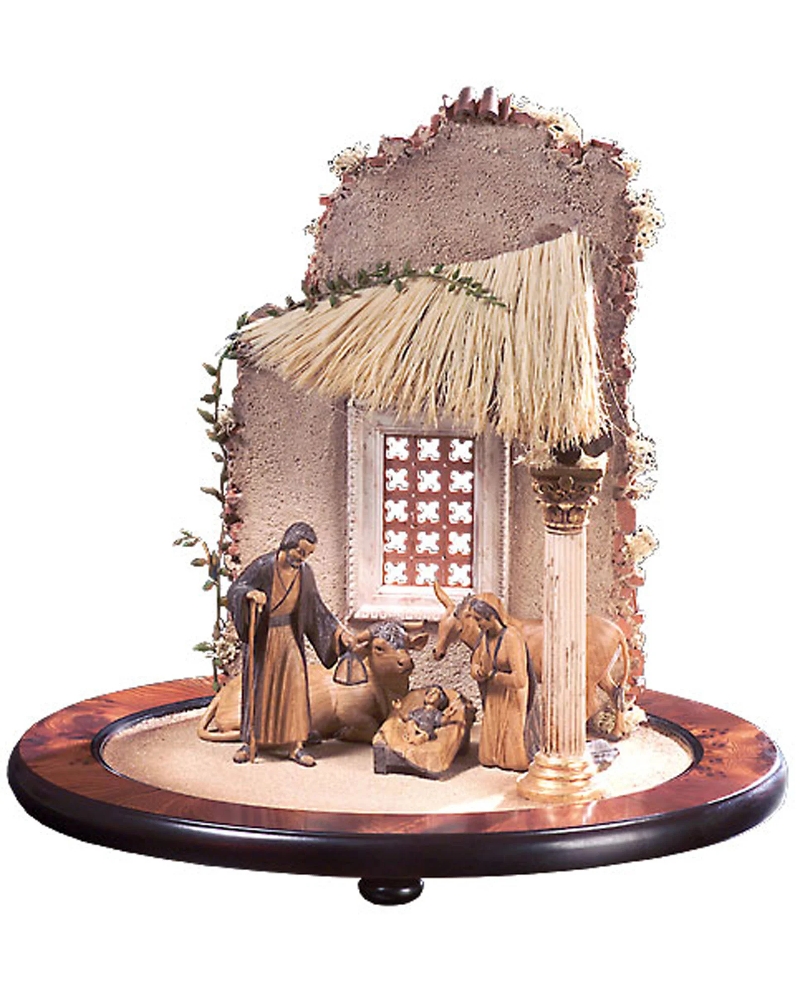 Carved wooden image. Holy Family, ruine, ox and donkey in wood.