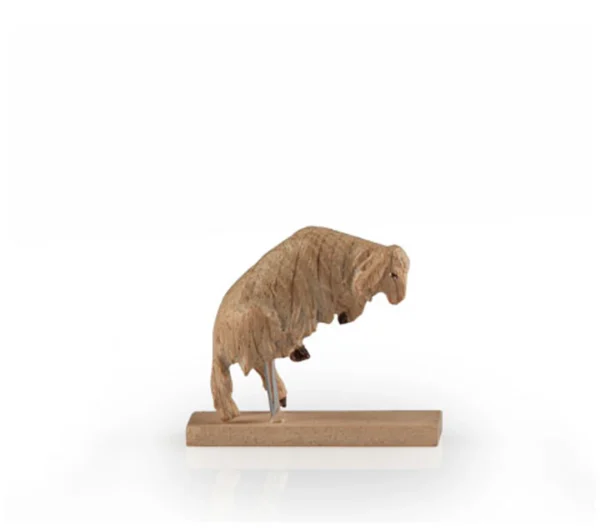 Carved wooden image. Lamb jumping for joy in natural wood carving.
