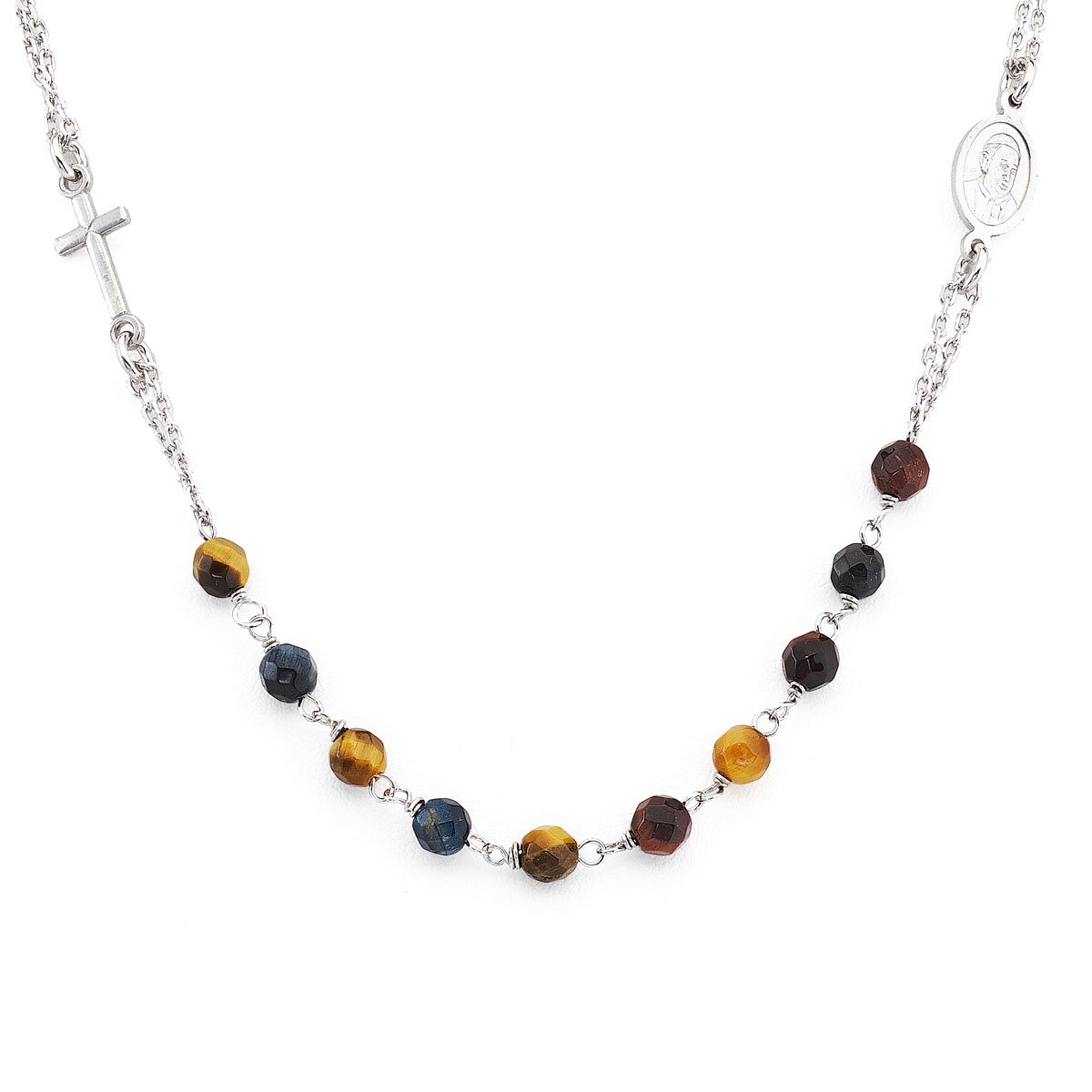 Choker with the representation of the Cross and the medal of Pope Francis, made in sterling silver 925 rhodium and tiger's-eyes.