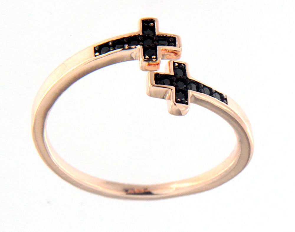 Elegante anillo con dos cruces y circonitas negras, realizado en plata de ley 925, chapado oro. Medida anillo: 14 mm. de diámetro. Medida de la cruces: 7 mm.