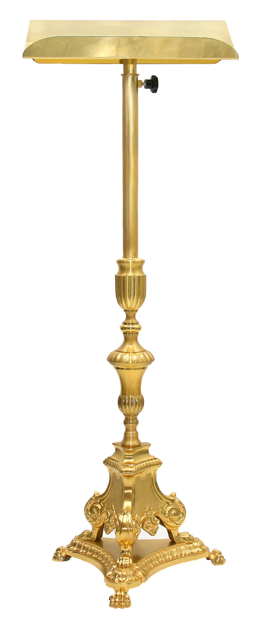 Elegante atril de pie troquelado, realizado artesanalmente de una calidad excepcional. Disponible en varios acabados.
