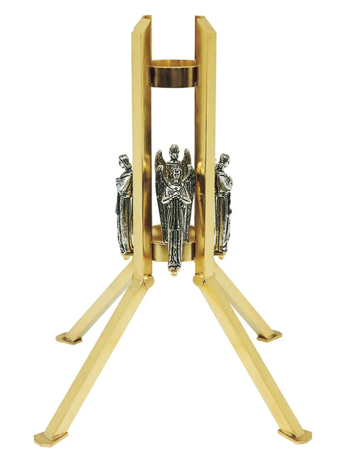 Base cirio pascual de metal bicolor, ornamentado con cuatro ángeles en la base. Preparado para un cirio pascual de 8 cm. de diámetro.