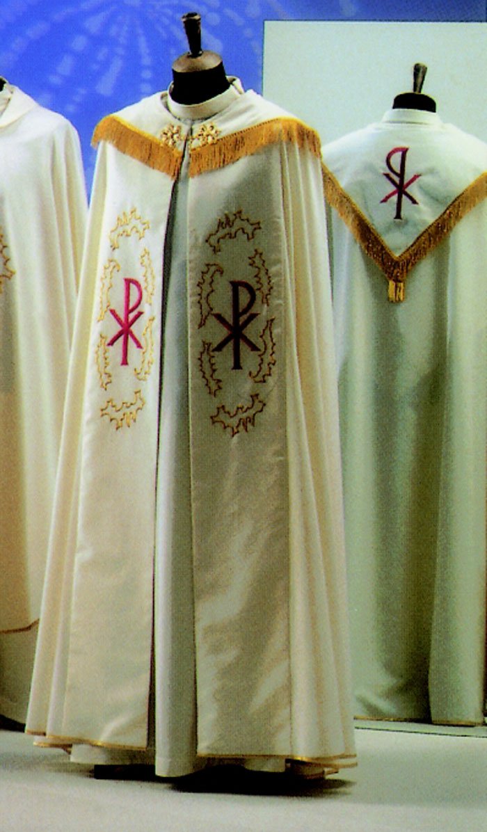 Práctica Capa Pluvial realizada de forma artesanal en el telar con una elaboración muy cuidada. Ornamentada con un elegante y estilizada bordado. En el precio se incluye la estola.