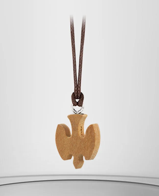 Colgante con la representación de la paloma en madera natural, con cordón.