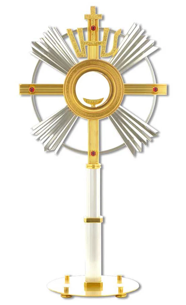 Espectacular ostensorio eucarístico fusión de latón con forma de IHS de una calidad y acabados excepcionales. El diámetro interior del viril es de 9,5 cm.