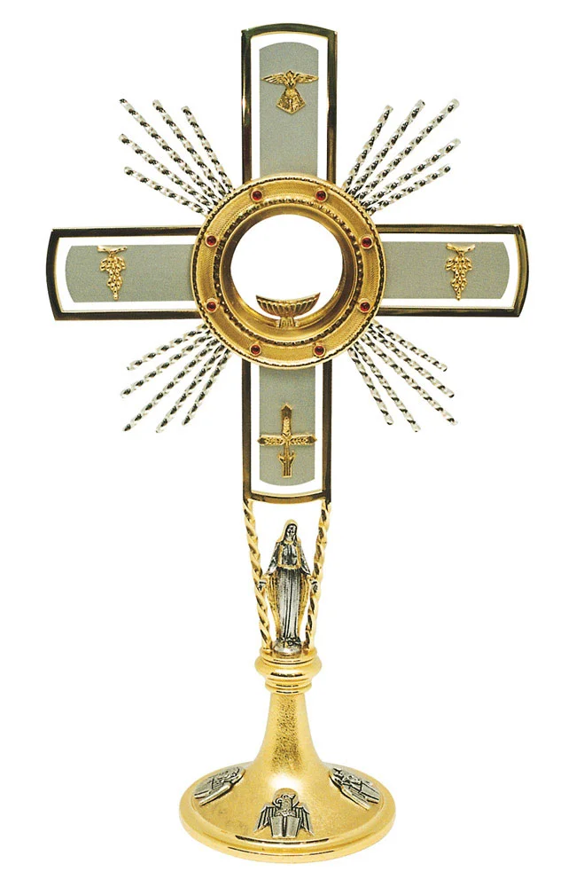 Espectacular ostensorio eucarístico fusión de latón con Virgen y paloma de una calidad y acabados excepcionales. El diámetro interior del viril es de 9,5 cm.