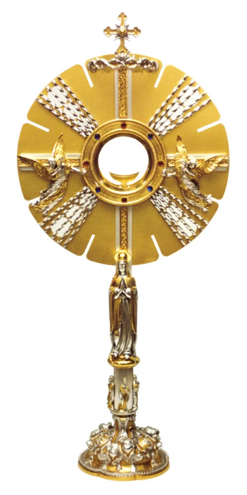 Espectacular ostensorio eucarístico fusión de latón con angeles de una calidad y acabados excepcionales. El diámetro interior del viril es de 9,5 cm.