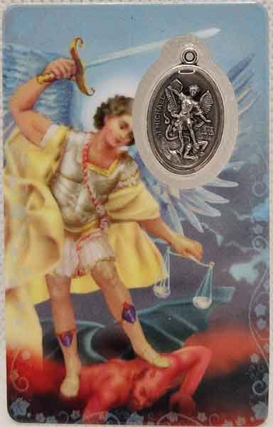 Elegante Estampa de San Miguel con medalla, plastificada con oración. Texto en español. Otros idiomas por encargo, consultar.