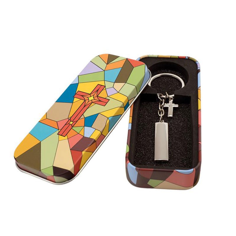Elegante llavero con cruz realizado en metal de excepcional calidad, presentado en una lata decorada.