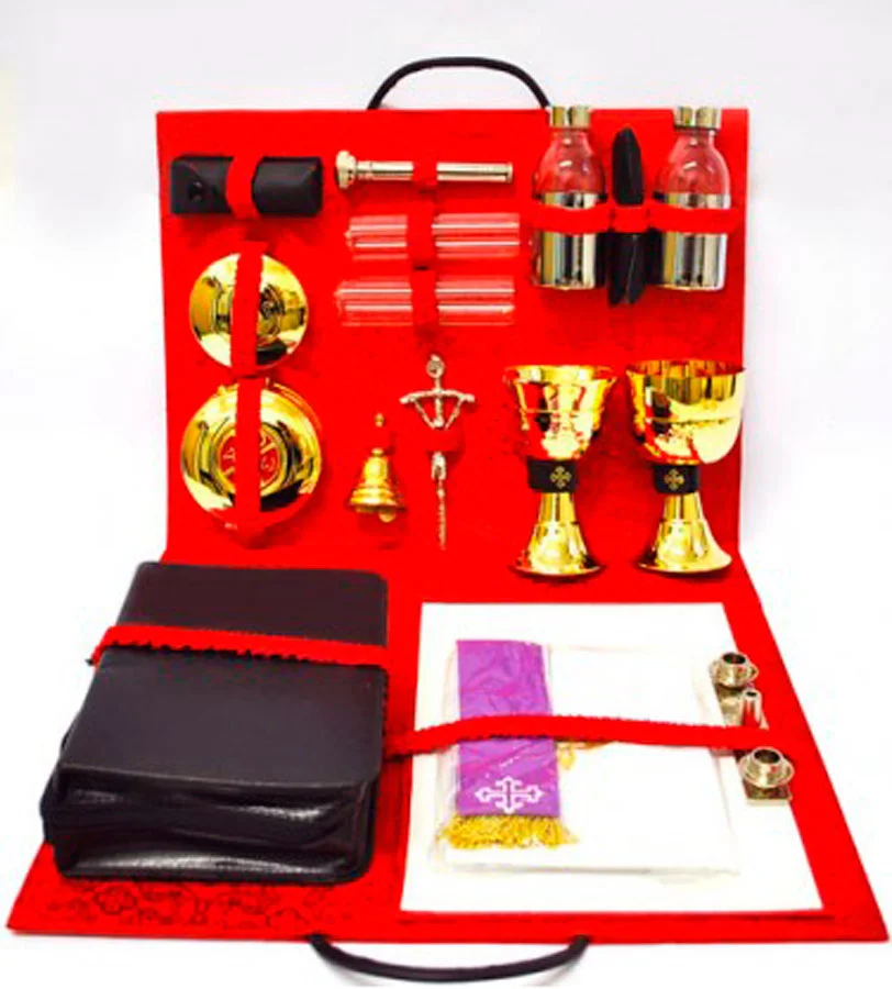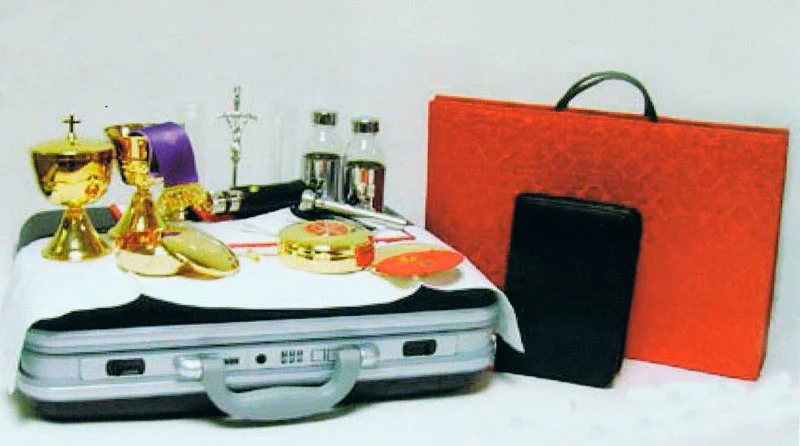 Maletín de mano negro con combinación, útil en su manejo. En un pequeño espacio todo lo necesario para la Celebración. El interior está forrado con satén rojo.