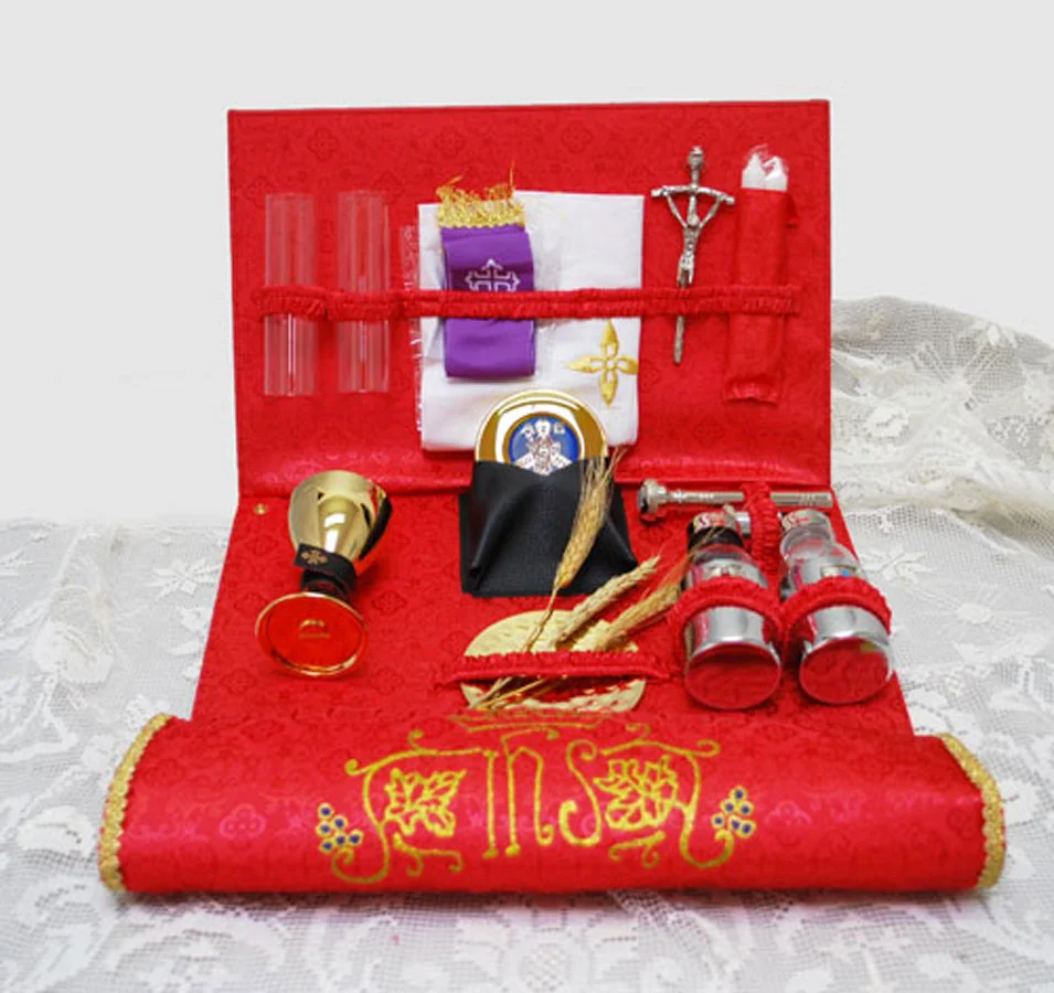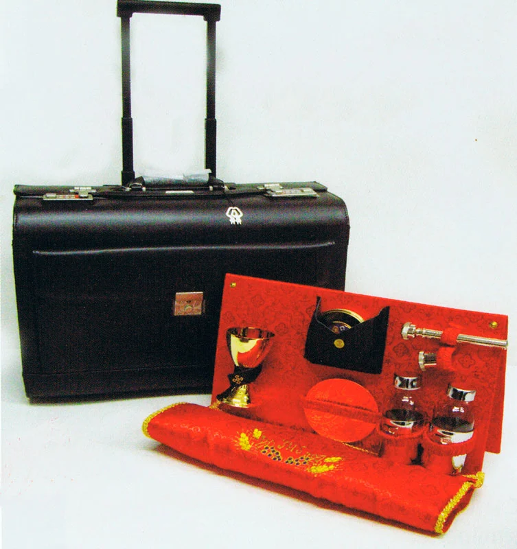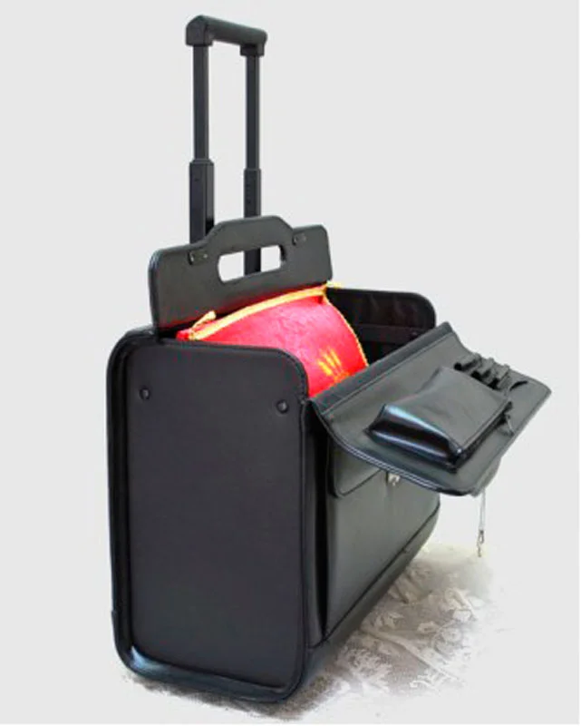 Maletín trolley de cuero ecológico con correa y combinación, útil en su manejo. En un pequeño espacio todo lo necesario para la Celebración. El interior está forrado en satén jacquard. Colores: Rojo, amarillo/oro y blanco damasco.