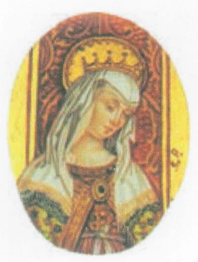 Medalla con representación de la Virgen Coronada (Criveli) en oro de 18 quilates o plata de ley pintada a mano (acuarela), caracterizada por una gran atención a todos los detalles y de excepcional calidad. La montura troquelada incluye rubíes, zafiros y esmeraldas.