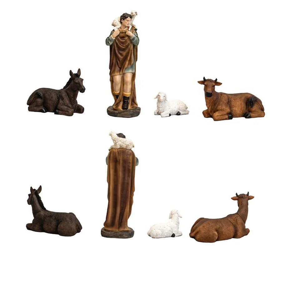 Precioso nacimiento completo con 11 piezas, medida 24 cm, realizada en resina decorada.