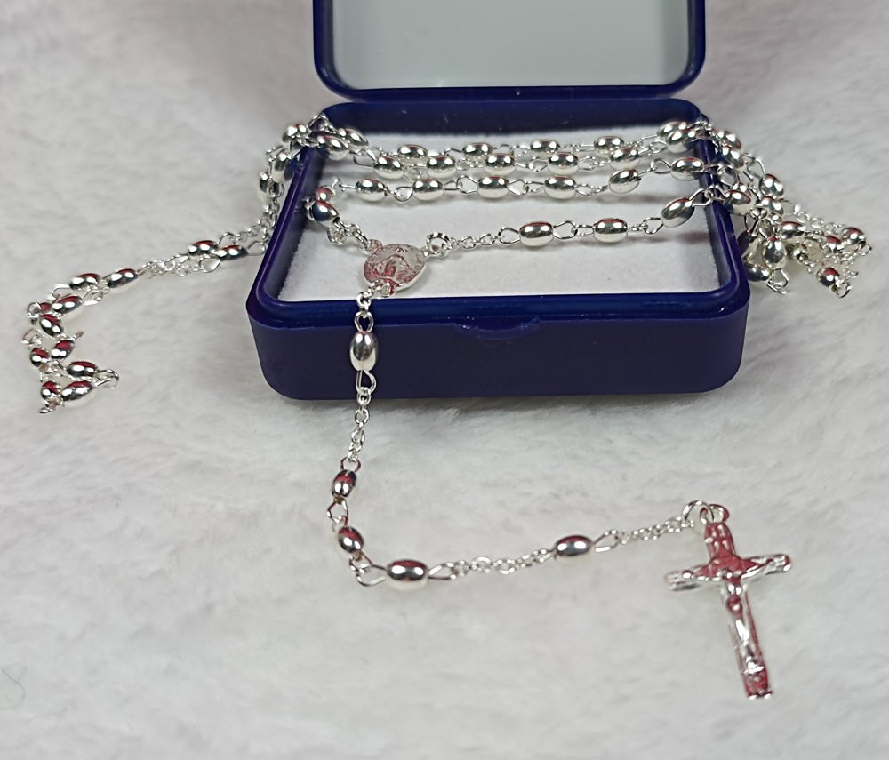 Rosario, realizado en plata de ley 925 con las cuentas ovaladas de excepcional calidad. Elegante y calido. Diámetro cuenta: 4x2 mm.